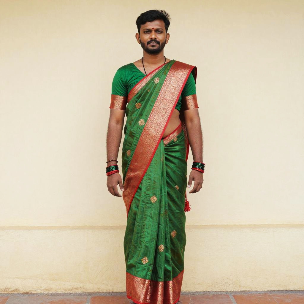 Tamil National Dress, a man in a green and red sari standing in front of a wall