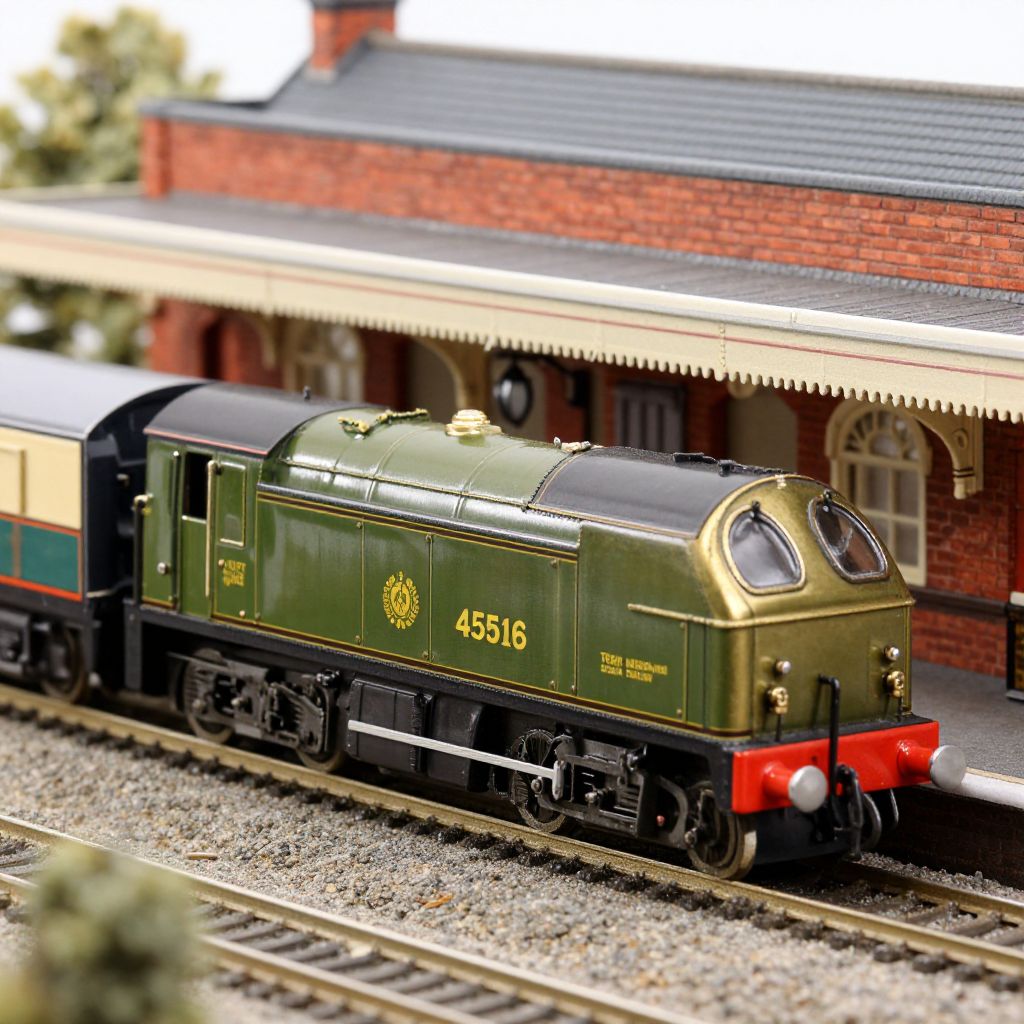 A highly detailed finescale brass model train, crafted in 7mm O gauge by Sancheng, depicts the BR Mixed Traffic Patriot locomotive \"45516\" themed as \"The Bedfordshire and Hertfordshire Regiment,\" featuring weathered textures and vibrant colors against a backdrop of a classic red brick station, rendered with meticulous realism and attention to historical accuracy.