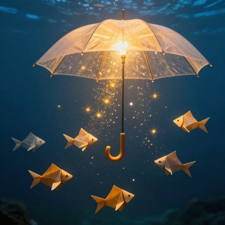 A surreal underwater scene where an open umbrella glows warmly, casting a shower of golden sparks into the depths, as origami fish emerge and swim gracefully through the ethereal, stardust-filled waters below.