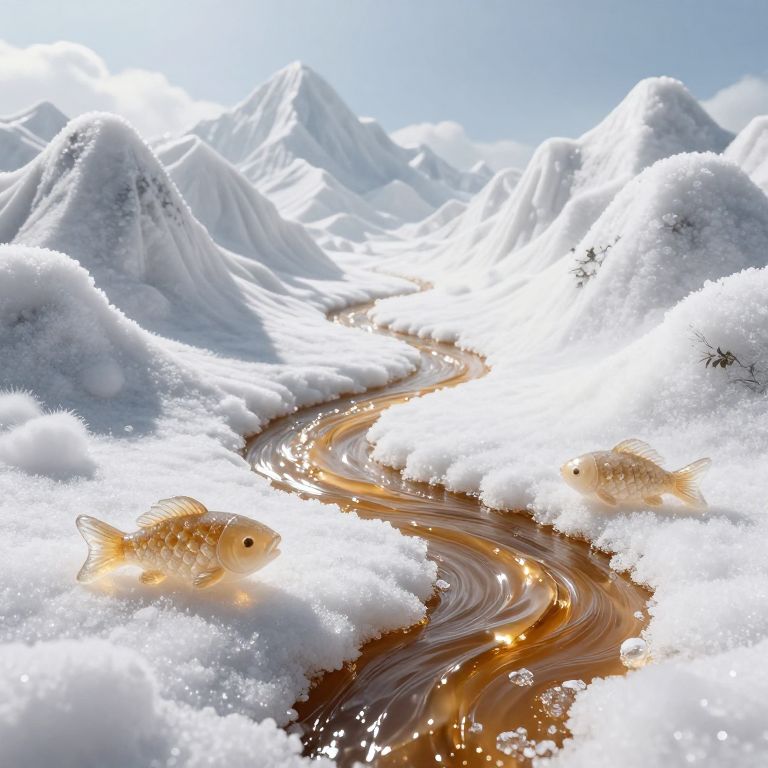 Rivers of syrup wind through sugar-sculpted mountains, where crystalline fish glitter and hum lullabies before dissolving into clouds of sugarplum flavors.