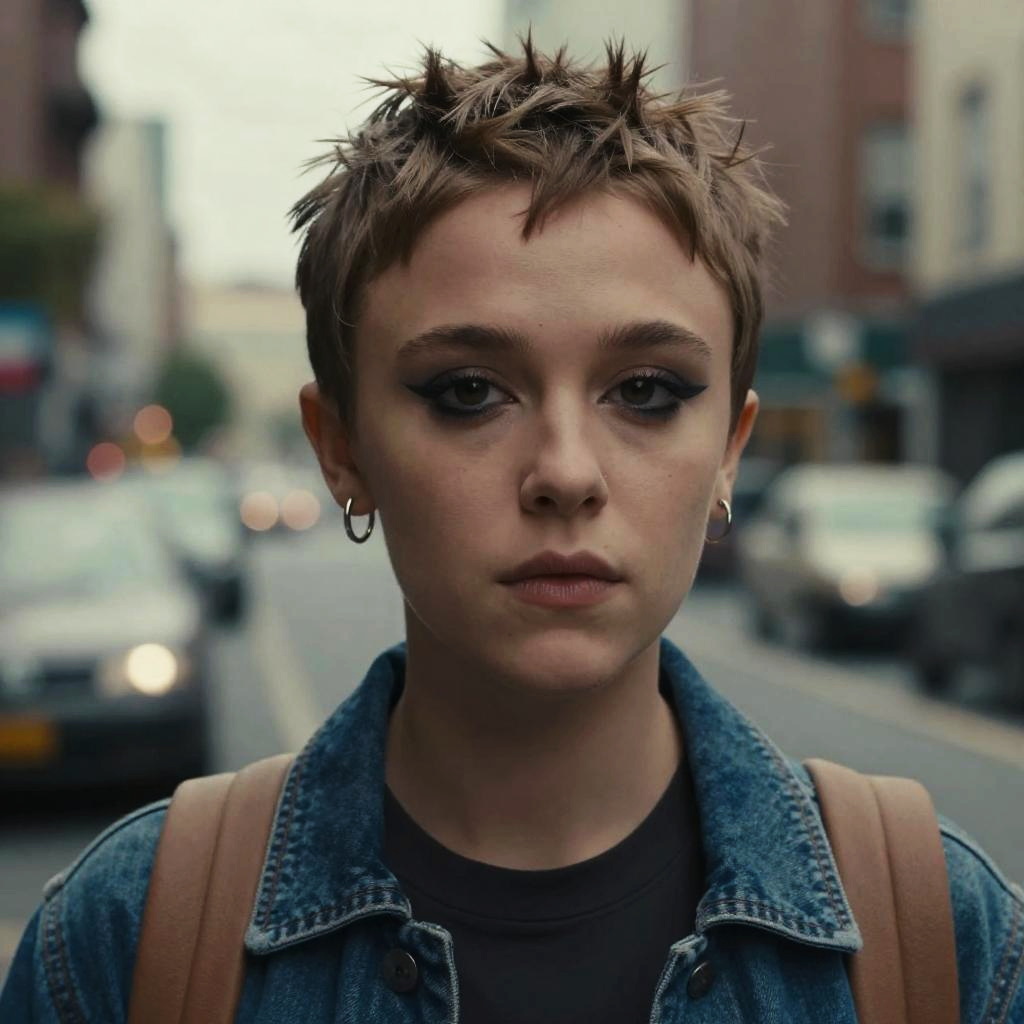 Millie Bobby Brown look alike, young woman with a pixie cut and delicate features, dramatic shadows, urban setting, moody atmosphere, high detail, vibrant colors
