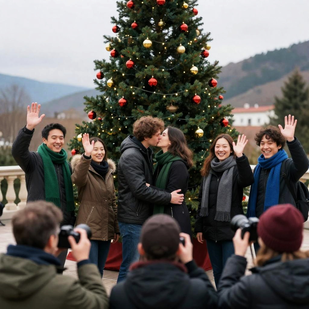 Photograph of a group of seven people in a festive room. A man in a red suit signs a green cloth for a woman in a red dress, leaning forward. Background includes Christmas tree, wrapped gifts, and string lights. Smiling, standing, casual attire, warm lighting.