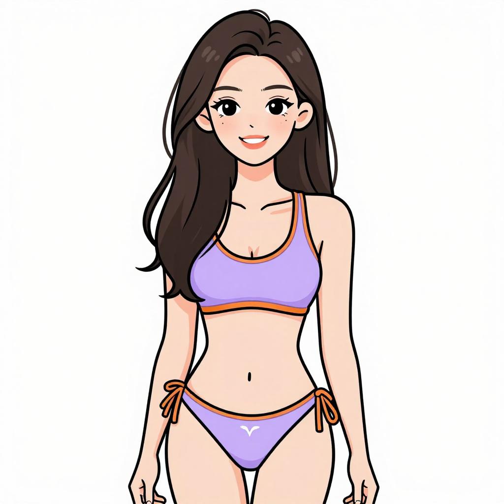 Woman with pretty face and pretty hair. smiling Woman, sporty swimwear, two-piece bikini in lavender, orange trim, scoop neck top, racerback style, matching low rise bikini bottoms with thin side straps, small logo detail, white studio background --sref 1467