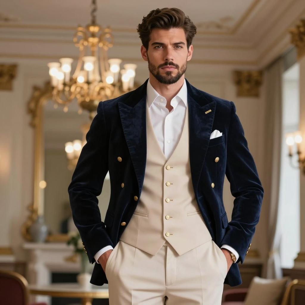 Modern groom costume, photograph of handsome man, standing, indoors, fashion model, wearing cream pants, white shirt, beige vest, dark blue velvet jacket with gold buttons and patches, hands in pockets, short dark brown hair, neatly styled, trimmed beard, serious expression, background blurry, elegant interior, chandelier in background, classical architecture, warm lighting, high fashion, formal attire, classic style, confident pose
