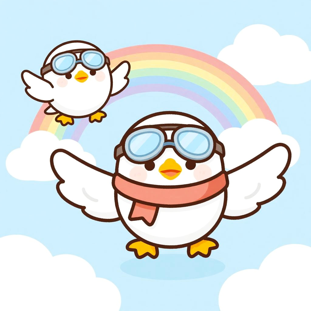 This digital drawing features two cartoon penguins against a light blue sky with white clouds and a rainbow. Both penguins are white with yellow beaks and feet, and wear blue aviator goggles. The larger penguin on the right has a pink scarf and is standing with arms outstretched, while the smaller penguin on the left is mid-flight, also with arms raised. The style is colorful and playful, with bold black outlines and a whimsical, cheerful atmosphere. The background is simple, focusing attention on the penguins and the rainbow.