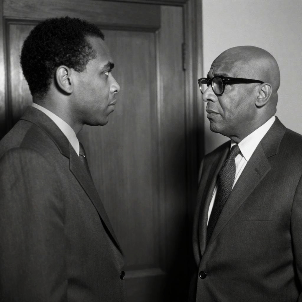 Black and white photograph of two men in a room. The man on the left has dark hair, wears a jacket, and faces right. The man on the right has bald head, wears glasses, suit, and tie, faces left. Wooden door between them. Intense expressions. Photographer: Gordon Parks.