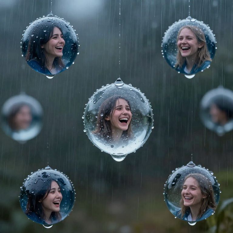Raindrops are collected in hollowed-out celestial spheres, each droplet containing not water, but frozen moments of laughter, grief, and unsung lullabies.