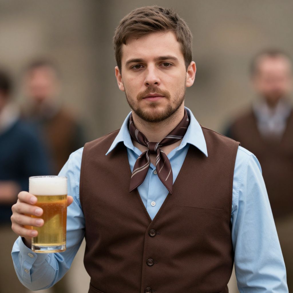 Beer themed costume, 1boy, male focus, solo, vest, shirt, looking at viewer, brown vest, neckerchief, blurry background, facial hair, brown hair, upper body, blurry, collared shirt, buttons, blue shirt, closed mouth, realistic