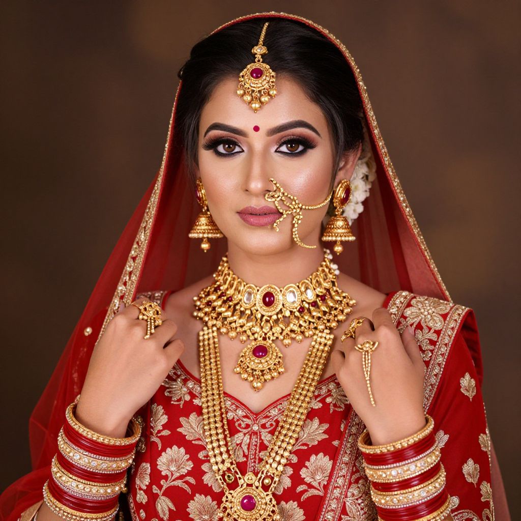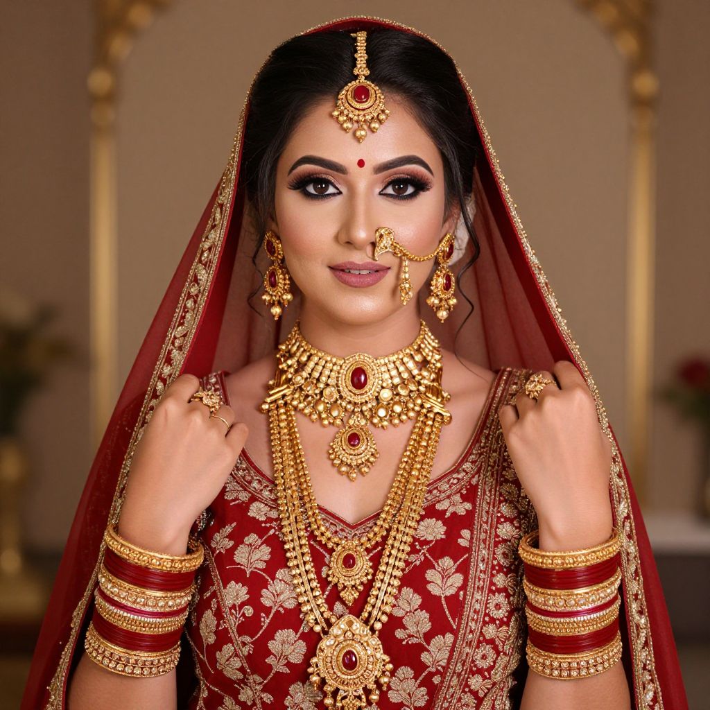 Radiant woman showcasing vibrant Indian bridal makeup trends, adorned with intricate gold jewelry, including layered necklaces, dangling earrings, and ornate bangles, complemented by a traditional red outfit featuring floral patterns and a matching forehead tiara.