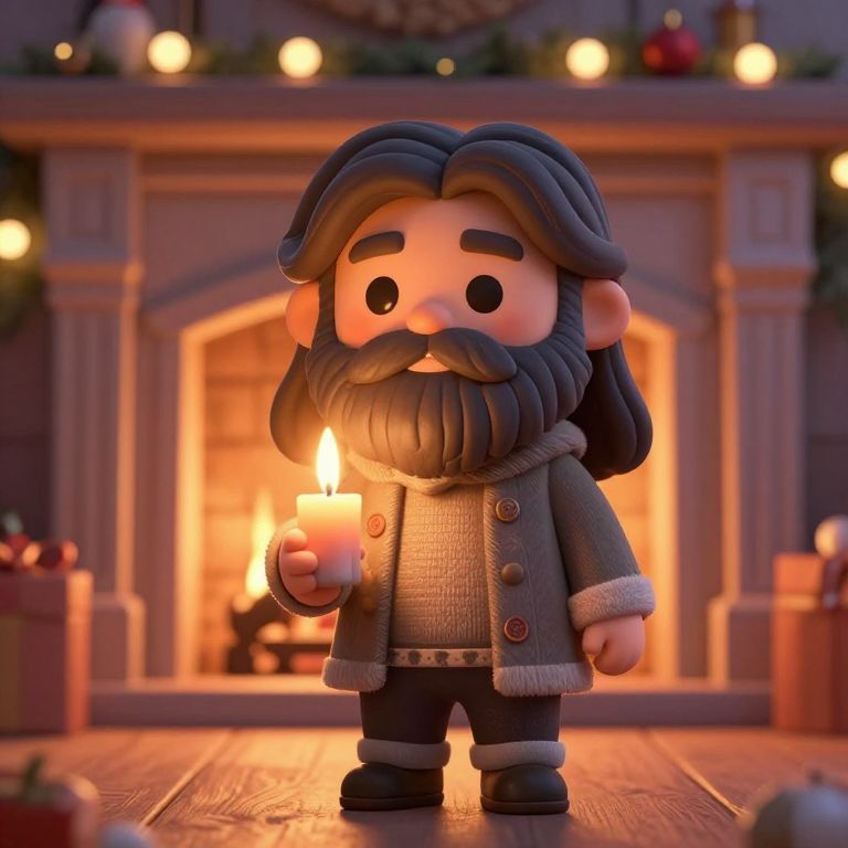 A photograph of a 3D cartoonish, bearded man with long dark hair, holding a lit candle. He wears a gray woolen coat with fur trim, black pants, and boots. The background features a warmly lit, decorative fireplace with glowing lights and Christmas presents on either side. The setting is cozy, with a wooden floor and festive garlands above the mantle. The man's face is round with simple black eyes and a thick mustache, and the overall style is whimsical and nostalgic. The candle's light casts a soft, warm glow on the man's face and coat.