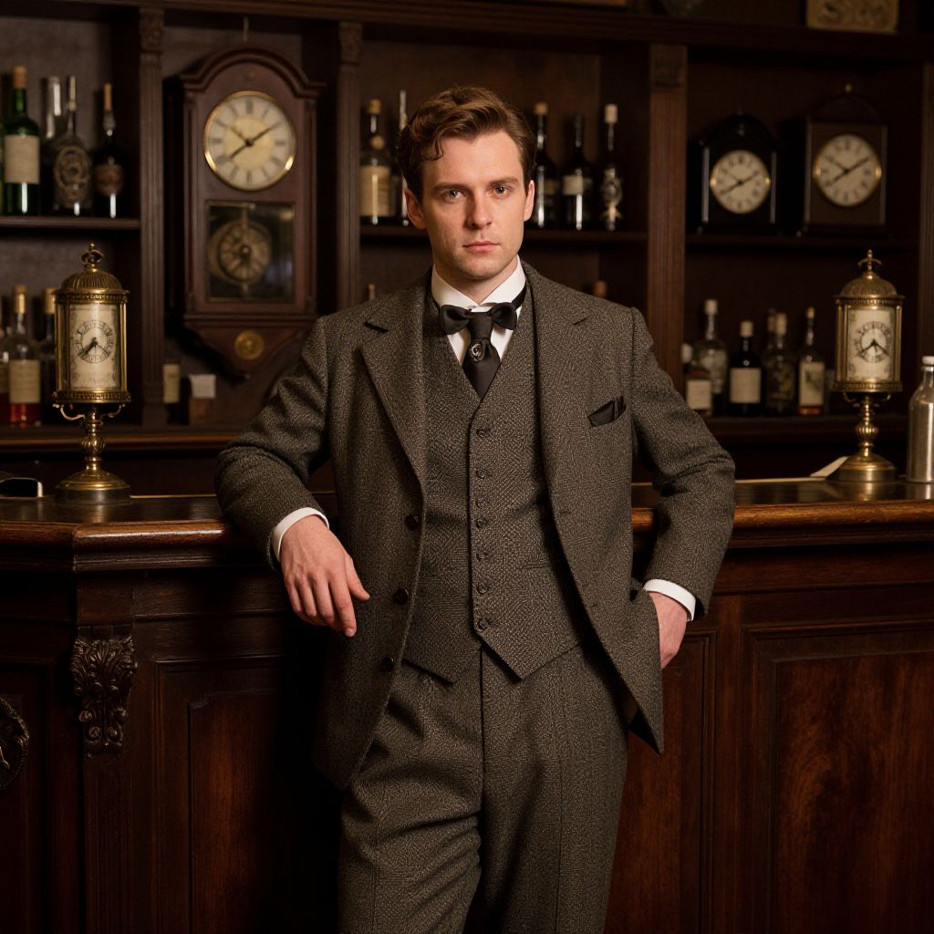 A man dressed in a vintage, dapper outfit stands confidently in an old-fashioned bar or apothecary setting. The environment is filled with antique clocks, bottles, and intricate details, evoking a classic, historical ambiance.