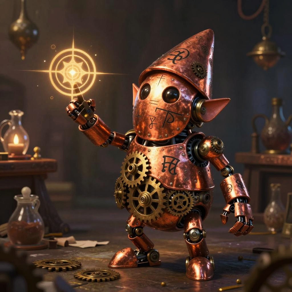 Clockwork gnome 5e, small robotic creature with copper plates and spinning cogwheels, interacting with magical symbols in a dimly lit alchemist's lab, fantasy artwork