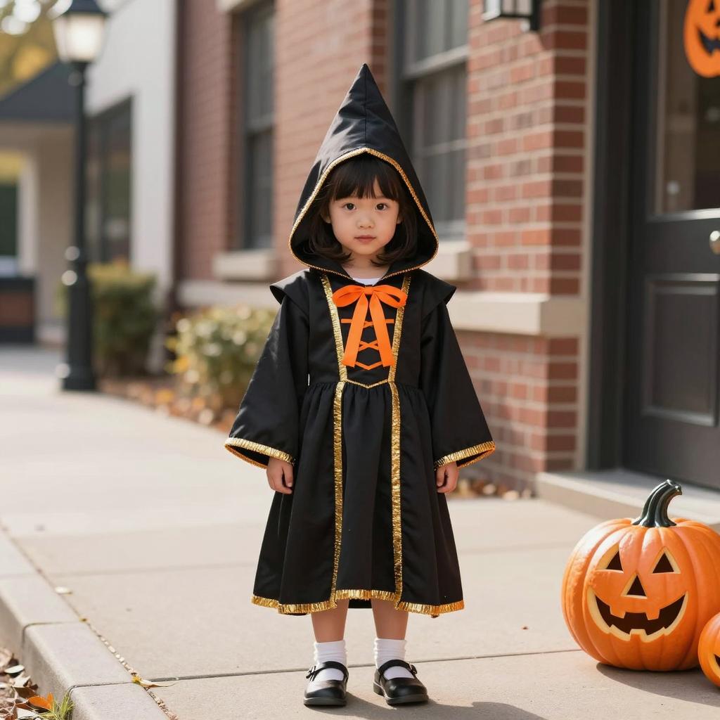 Child carnival costume, photograph of a young child wearing an elaborate, colorful outfit, standing in front of a wooden doorway, bright orange and red costume with gold accents, large pink and red feathered hat, striped socks, white sneakers, sunny outdoor setting, blurred background, child smiling, detailed costume, whimsical and festive style, daylight, polished brick floor, ornate door frame, vibrant colors, realistic ures, kid-friendly fantasy attire