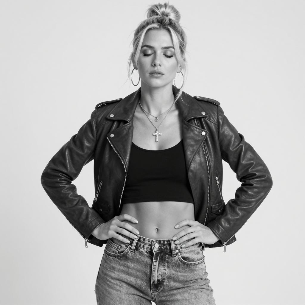 Black and white photograph of a woman with short blonde hair, sitting, holding a cigarette to her lips. She wears a low-cut black top, ornate necklace with a central pendant, and multiple rings. Her eyes are closed, head tilted slightly back. Background is dark and plain. Her left arm rests on her knee, right hand holding the cigarette. Her nails are long and painted white.
