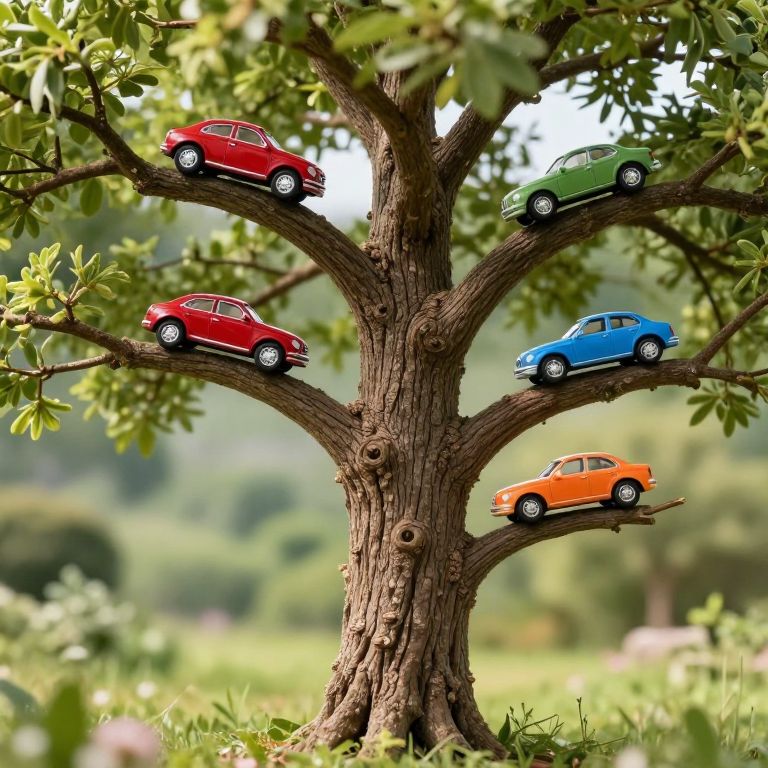 The image depicts a whimsical scene where a large, mature tree is adorned with a series of miniature toy cars, each perched on different branches. The tree, with its robust trunk and sprawling branches, stands prominently in the foreground, its bark textured and detailed. The toy cars, varying in color and design, are meticulously arranged on the branches, creating a playful and imaginative tableau. From top to bottom, the cars include a vibrant red, a sleek green, a classic blue, a warm orange, and a muted beige. The arrangement of the cars on the tree branches suggests a deliberate and artistic placement, with each car appearing to be in a different stage of growth, as if the tree itself is nurturing these miniature vehicles. The background is a soft, blurred landscape of greenery, enhancing the focus on the tree and its unique cargo. The overall composition is harmonious, blending the natural and the whimsical in a visually striking manner.