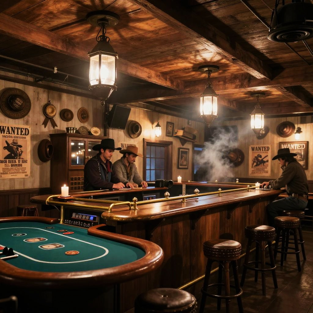 Photograph of five medieval-style men playing cards around a green wooden table in a dimly lit, stone-walled room with a chandelier and tape