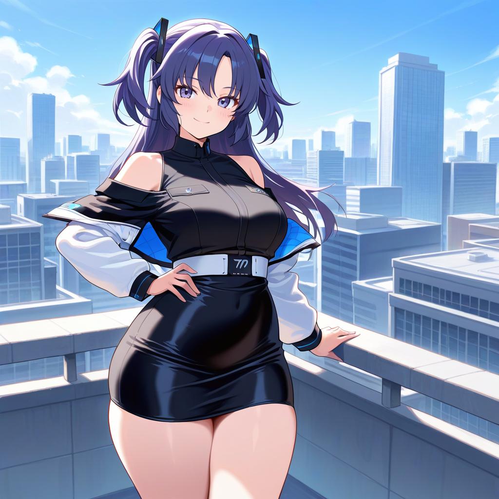 Blue sky, 1girl, solo, cropped legs, hand on hips, yuuka, formal, rooftop, white jacket, off-shoulder jacket, multicolored jacket, black uniform, black jacket, black skirt, [thick thighs], looking at viewer, smile, red pupils, outdoors, modern city, skyscraper, pov