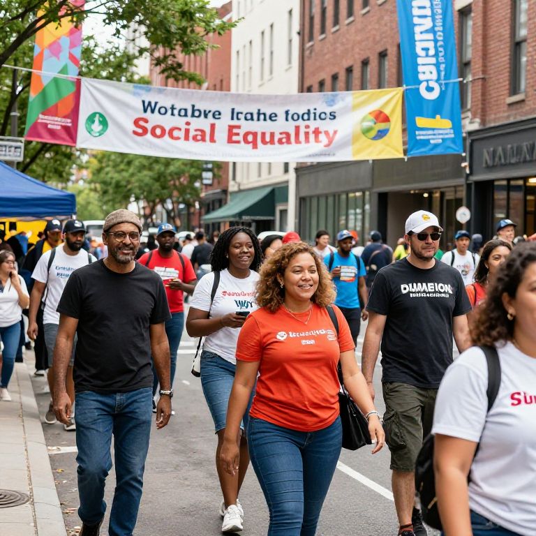A bustling city street where people of all ages, races, and genders are participating in a community event promoting social equality, with colorful banners and smiling faces capturing the spirit of unity and inclusion.
