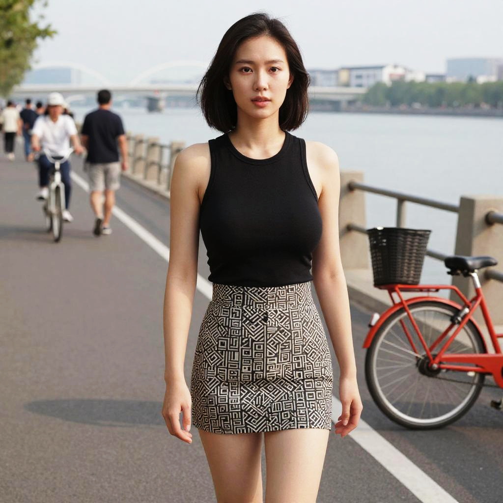 A slim woman in a casual chic black sleeveless top and high-waisted mini skirt with a geometric pattern, styled in cinecolor, stands near a waterfront promenade with cyclists. Sexy. Pretty face and beаutiful eyes. Big breasts
