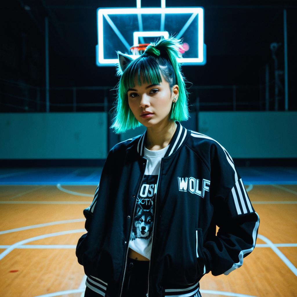 Portrait of a young woman with neon green wolf cut hairstyle and cat ear accessories standing on an urban basketball court. She is wearing a black streetwear jacket with 'WOLF' printed on it, a graphic t-shirt, and has a serious fashion editorial expression, illuminated by neon lighting.
