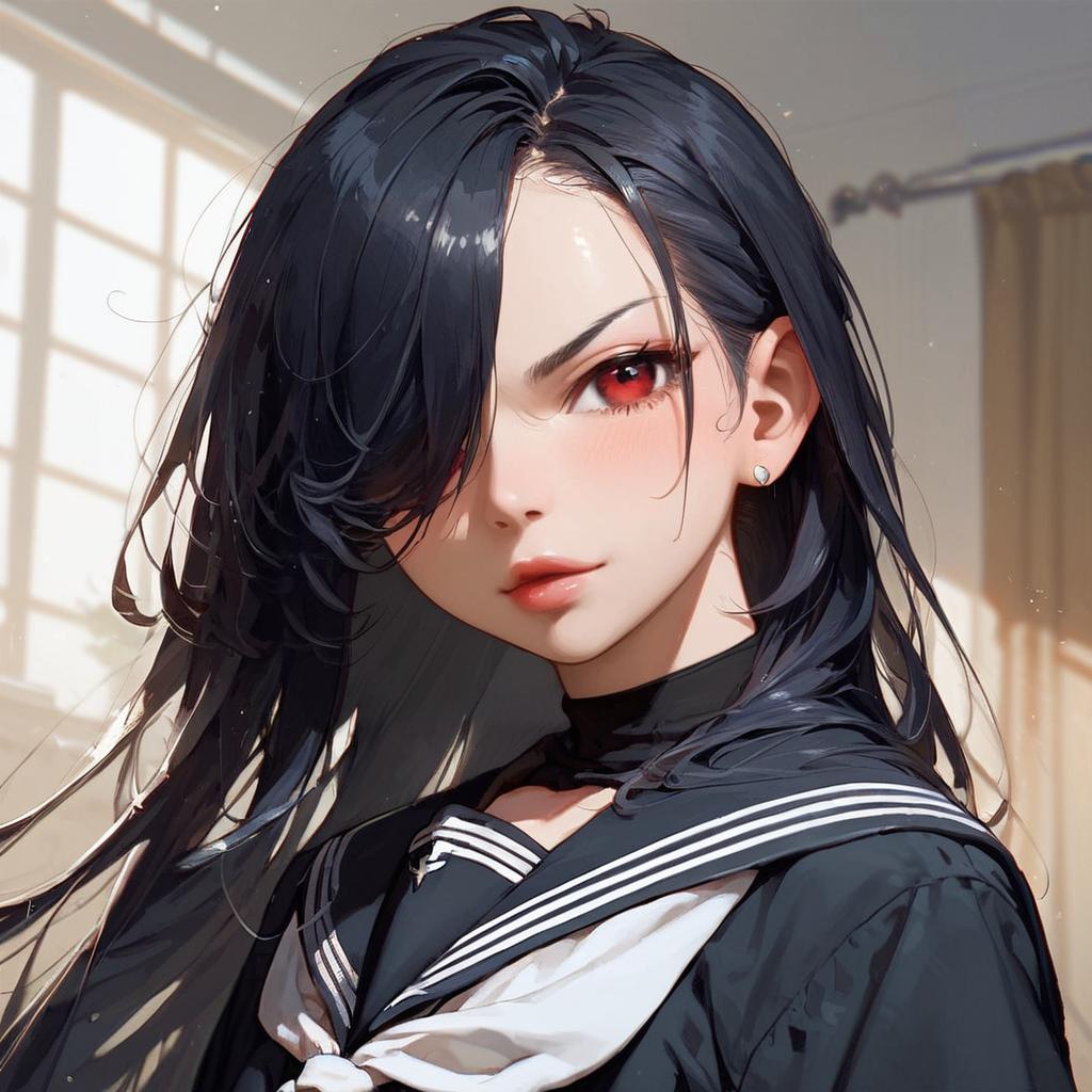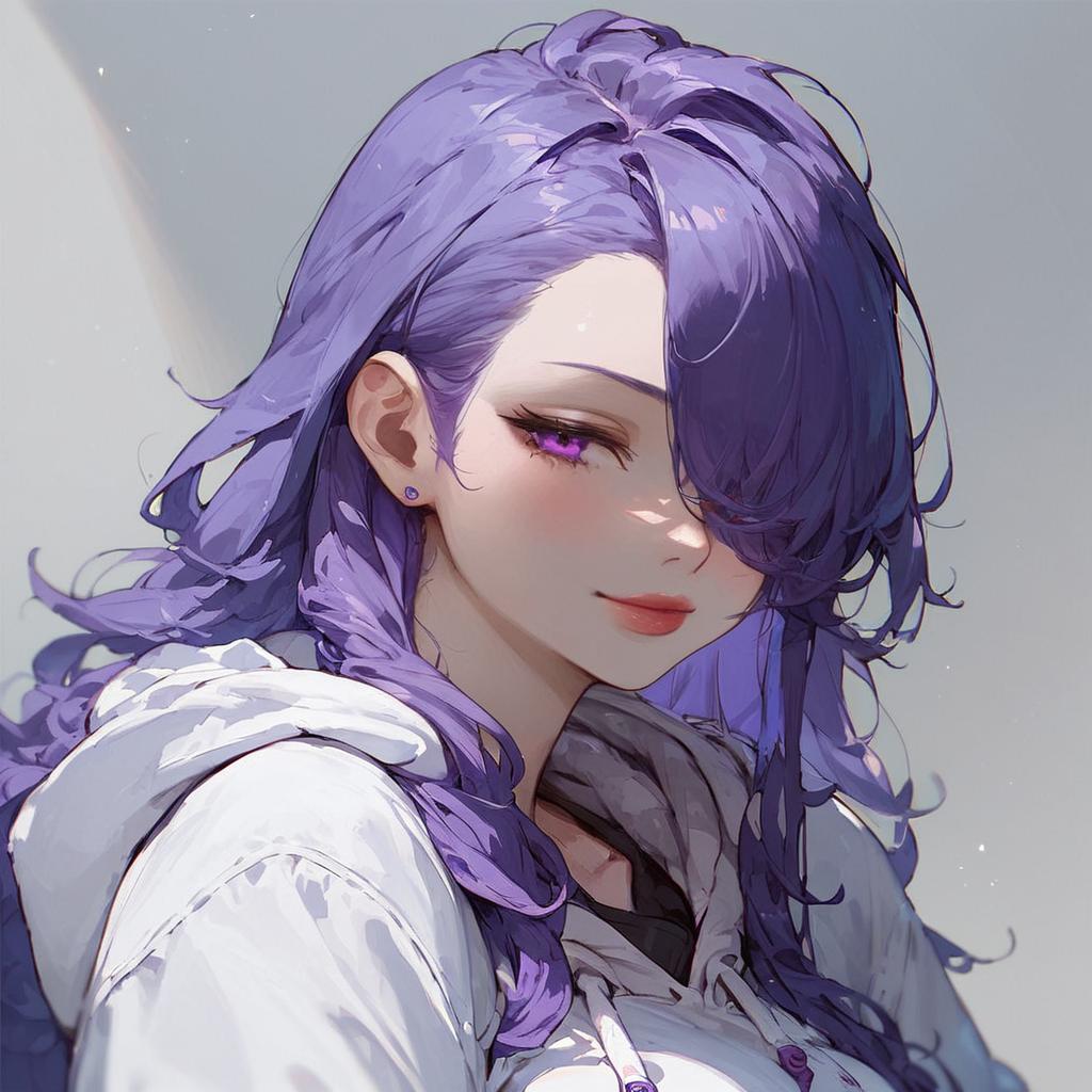 Score_9, score_8_up, score_7_up, source_anime 1girl, solo, purple hair, long hair, hair over one eye, purple eyes, hoodie, hood down, smug, looking at viewe