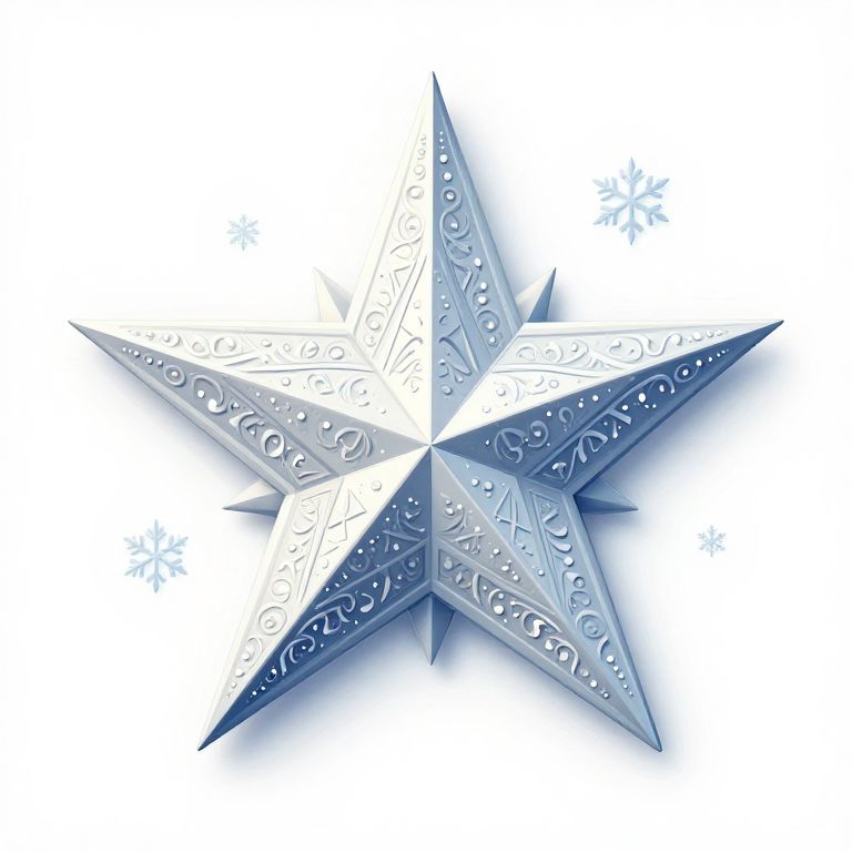 The image presents a highly detailed, intricate star with a winter and magical theme. The star is centrally positioned against a white background, exuding a sense of symmetry and balance. Its design features a series of layered, geometric shapes that create a sense of depth and complexity. The star's edges are sharp and well-defined, while its center is adorned with delicate patterns that add to its ornate appearance. Small snowflakes are scattered around the star, enhancing the wintry atmosphere. The overall composition is harmonious, with the star being the focal point, surrounded by the soft, white background that accentuates its details. The image has a studio photography quality, with a high level of realism and attention to detail, making it visually striking and captivating.