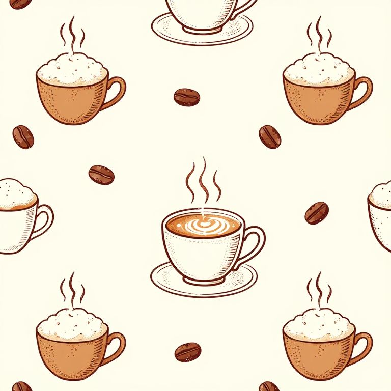 A playful and whimsical vector art pattern featuring hand-drawn cups of cappuccino with frothy tops, interspersed with small coffee beans and steam puffs, creating a cozy and inviting retro aesthetic.