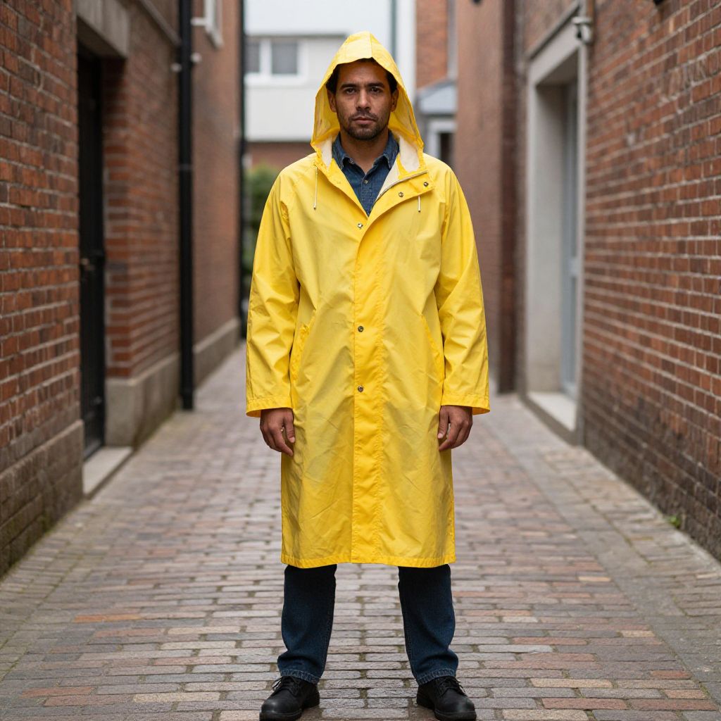 Photograph of a Black man standing in a narrow, brick-lined alleyway. He wears a bright yellow, hooded raincoat that reaches his knees, over a dark blue shirt and black pants. His black shoes are slightly worn. He has a medium build, short black hair, and a trimmed beard. His expression is serious, with a slightly furrowed brow. The alleyway has a cobblestone path and is flanked by red brick buildings. The background is slightly blurred, drawing focus to the man. The overall composition creates a stark contrast between the bright yellow raincoat and the muted, earthy tones of the alleyway.
