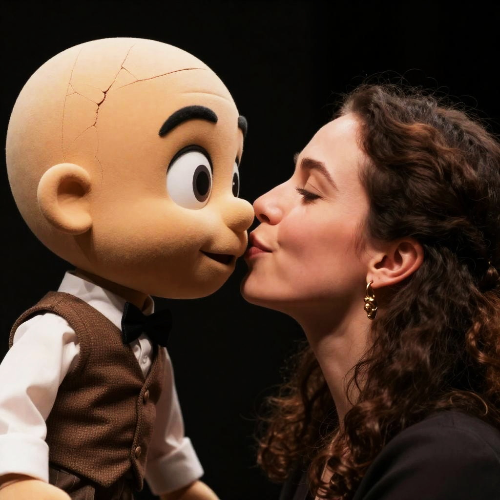 A photograph of a woman with curly brown hair and gold earrings kissing a large-eyed puppet with a cracked headpiece. The puppet is dressed in a white shirt, brown vest, and black bow tie. Both the woman and puppet are smiling against a dark background.