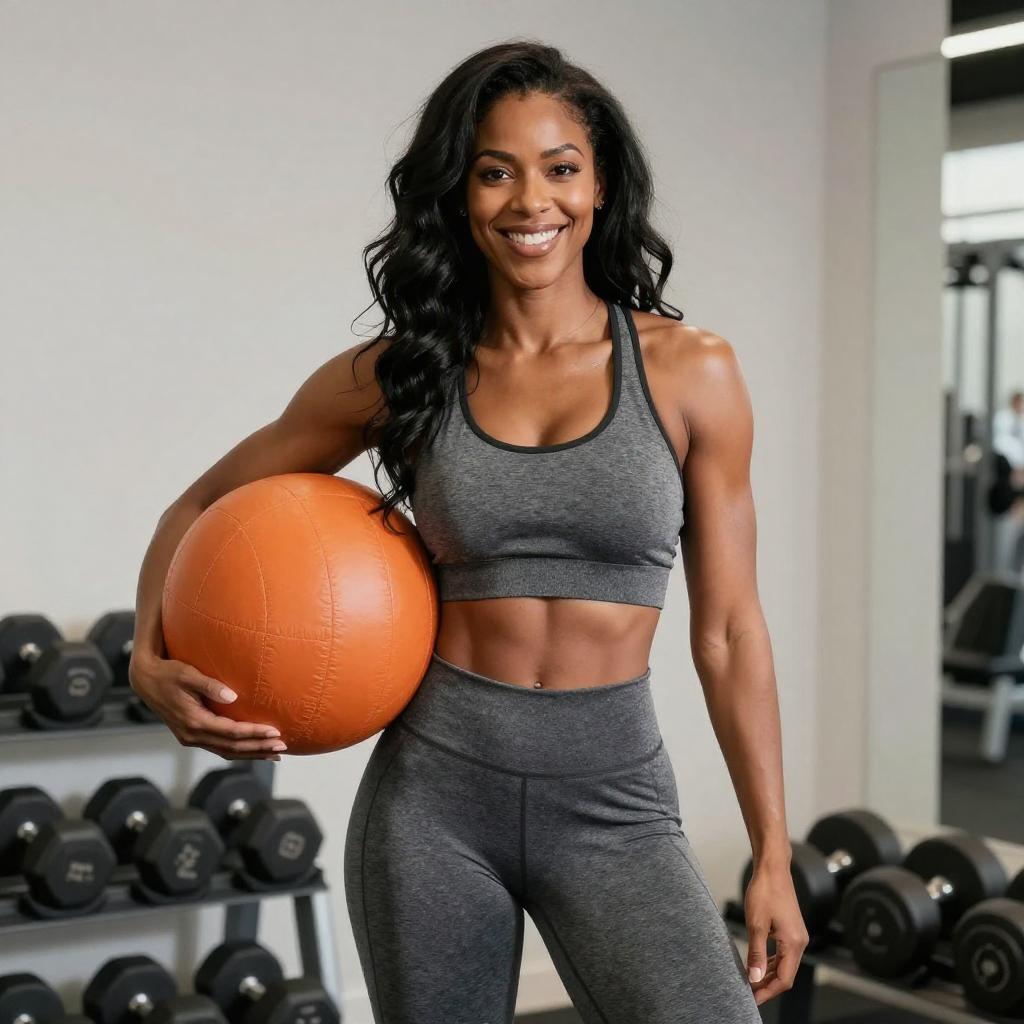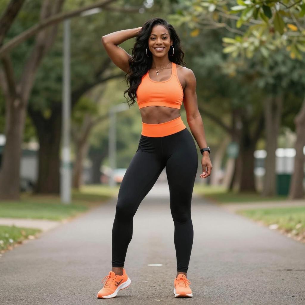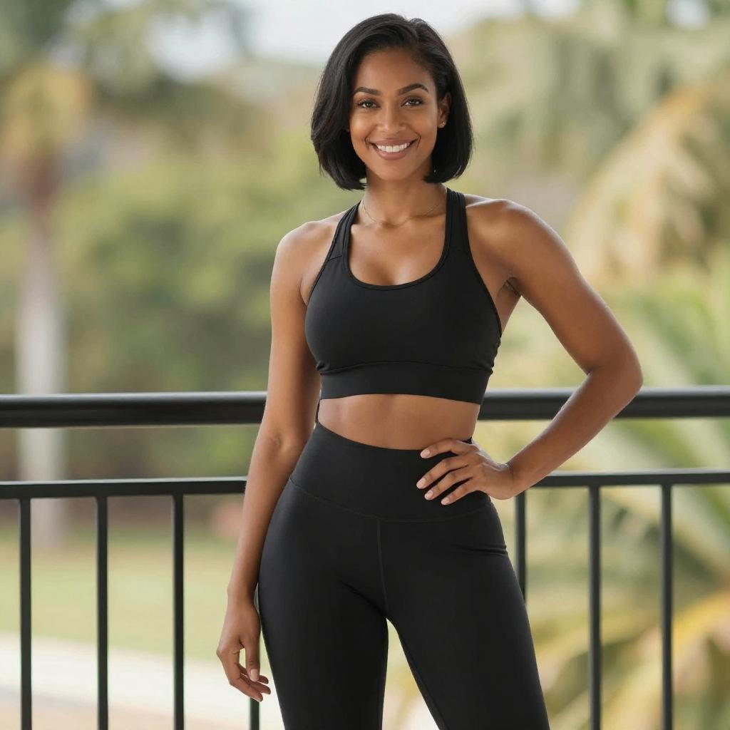 Photograph of a fit, dark-skinned woman with a short black bob haircut, standing on a balcony. She wears a black sports bra and high-waisted, black, ured leggings, highlighting her toned arms and legs. She smiles confidently, with one hand on her hip. The background shows blurred greenery and a black metal railing.