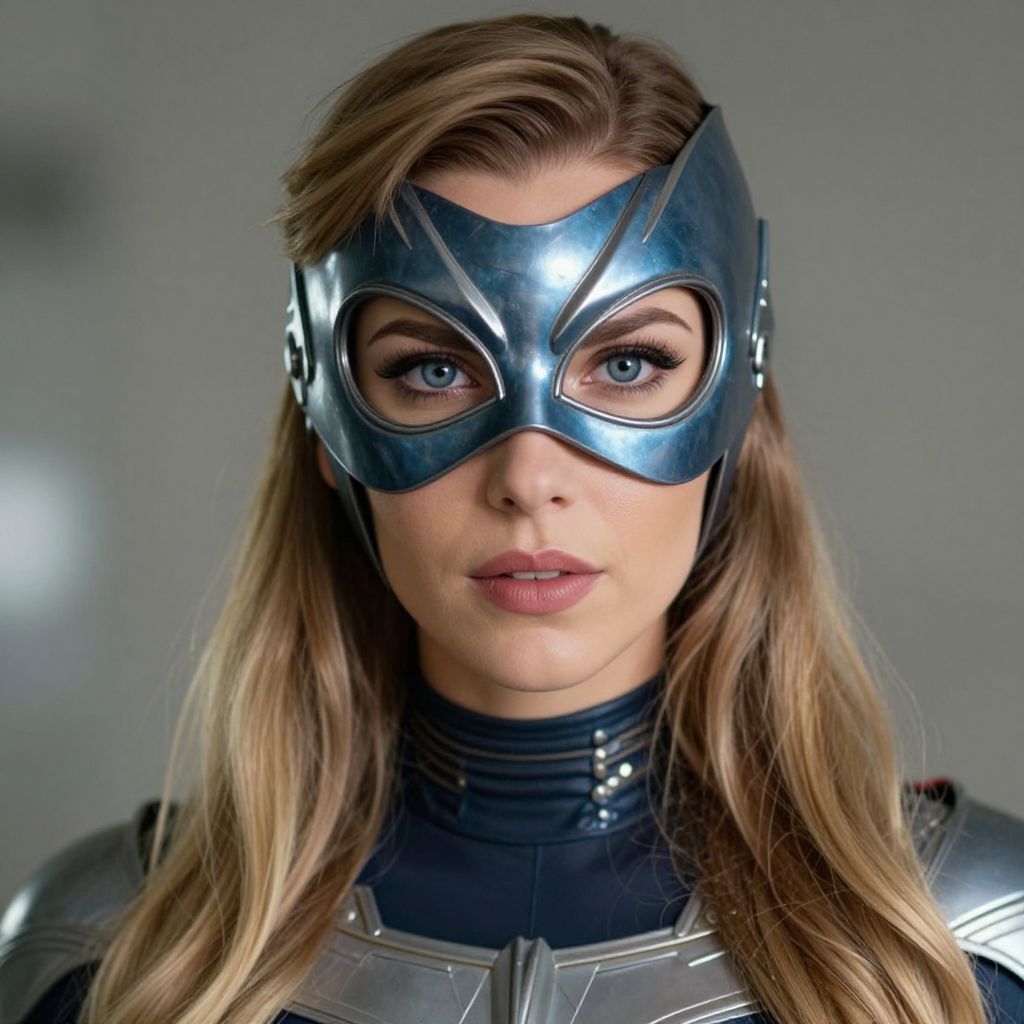 Photograph of a blonde woman with blue eyes wearing a shiny blue superhero mask and silver armor, looking directly at the camera against a gray background.