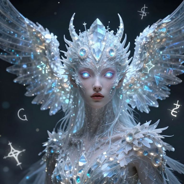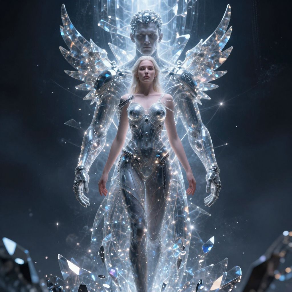 A digital CGI image featuring a blonde woman with pale skin, standing confidently at the center. She wears a futuristic, silver, body-hugging bodysuit adorned with crystalline, wing-like structures on her back and shoulders. The bodysuit is highly reflective, showcasing intricate patterns and light reflections. Behind her, a semi-transparent, ethereal figure with a similar crystalline appearance is visible, creating a sense of depth and otherworldliness. The background is dark with a subtle, star-like sparkle, enhancing the celestial and futuristic theme. The overall style is high-tech and surreal, with a focus on light and texture.