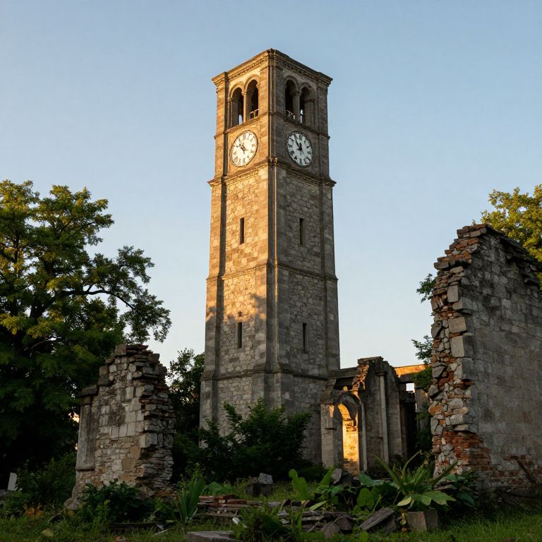 Photograph of a tall, rectangular, stone clock tower with arched windows and a white clock face, standing amidst the ruins of an old, partially collapsed building. The tower is bathed in warm, late-afternoon sunlight, casting shadows on its weathered facade. Surrounding the tower are overgrown bushes and trees, with one large tree on the left. The sky is clear and blue, enhancing the rustic, historic atmosphere. The ruins feature broken brick and stone walls with visible textures and decay. The image conveys a sense of age and abandonment, with vibrant colors contrasting the old, gray stones.
