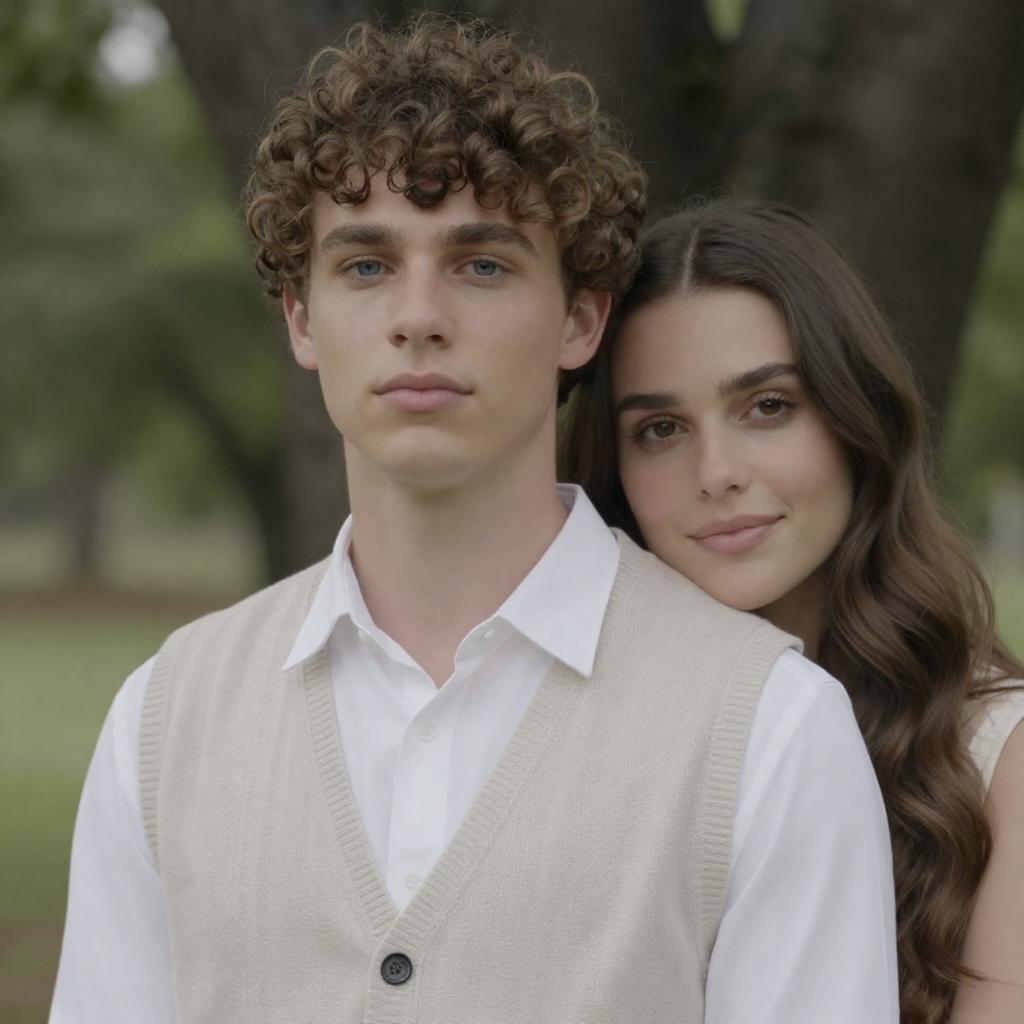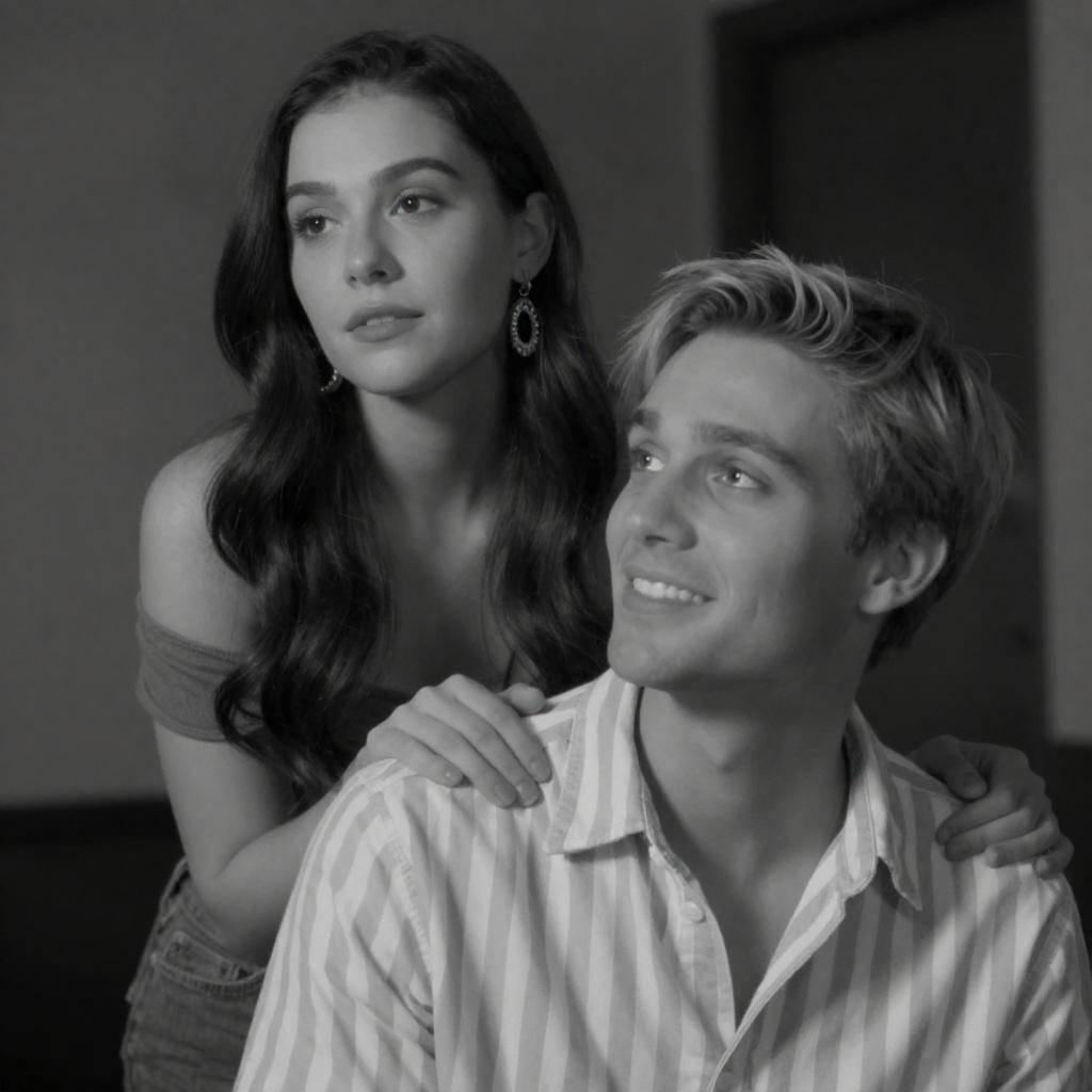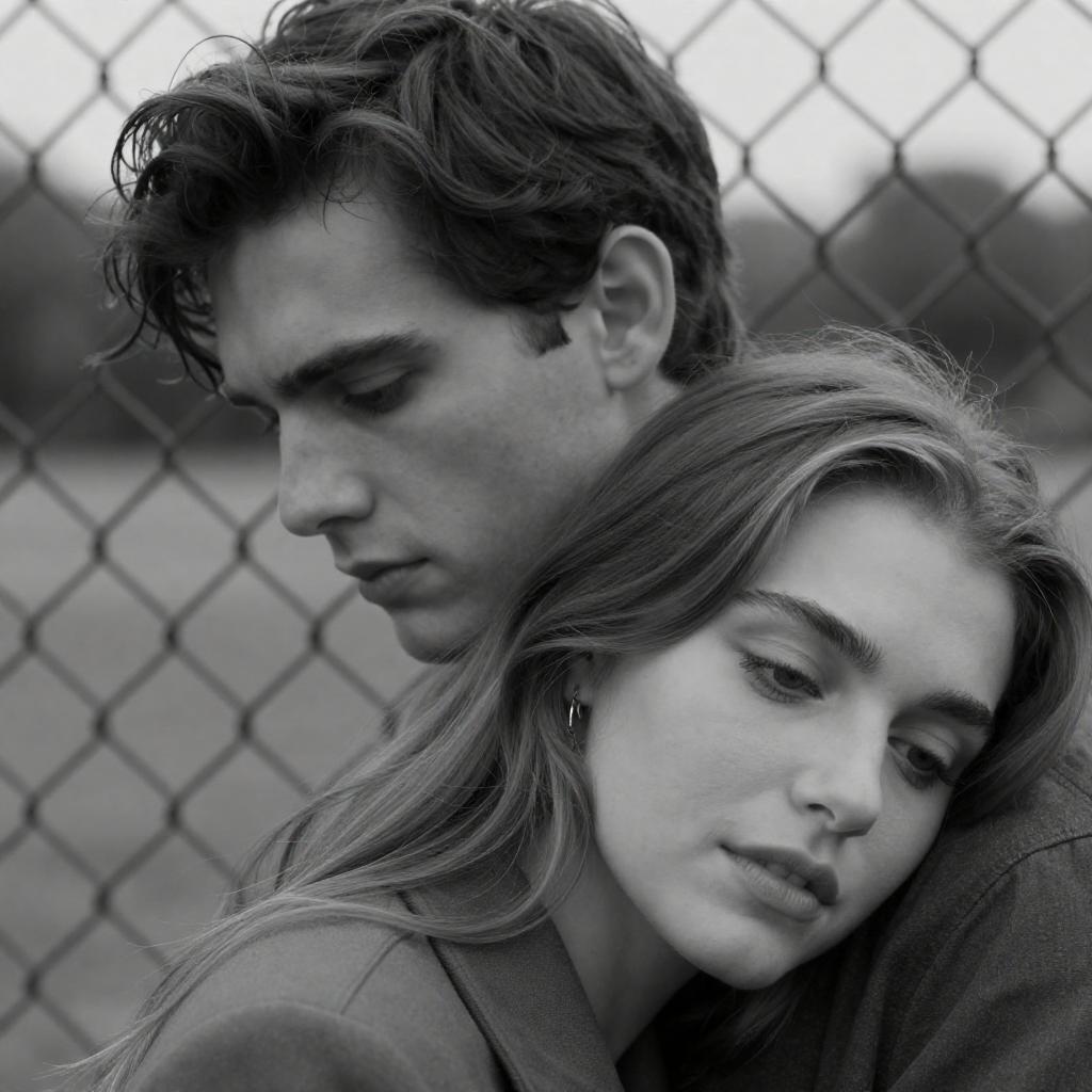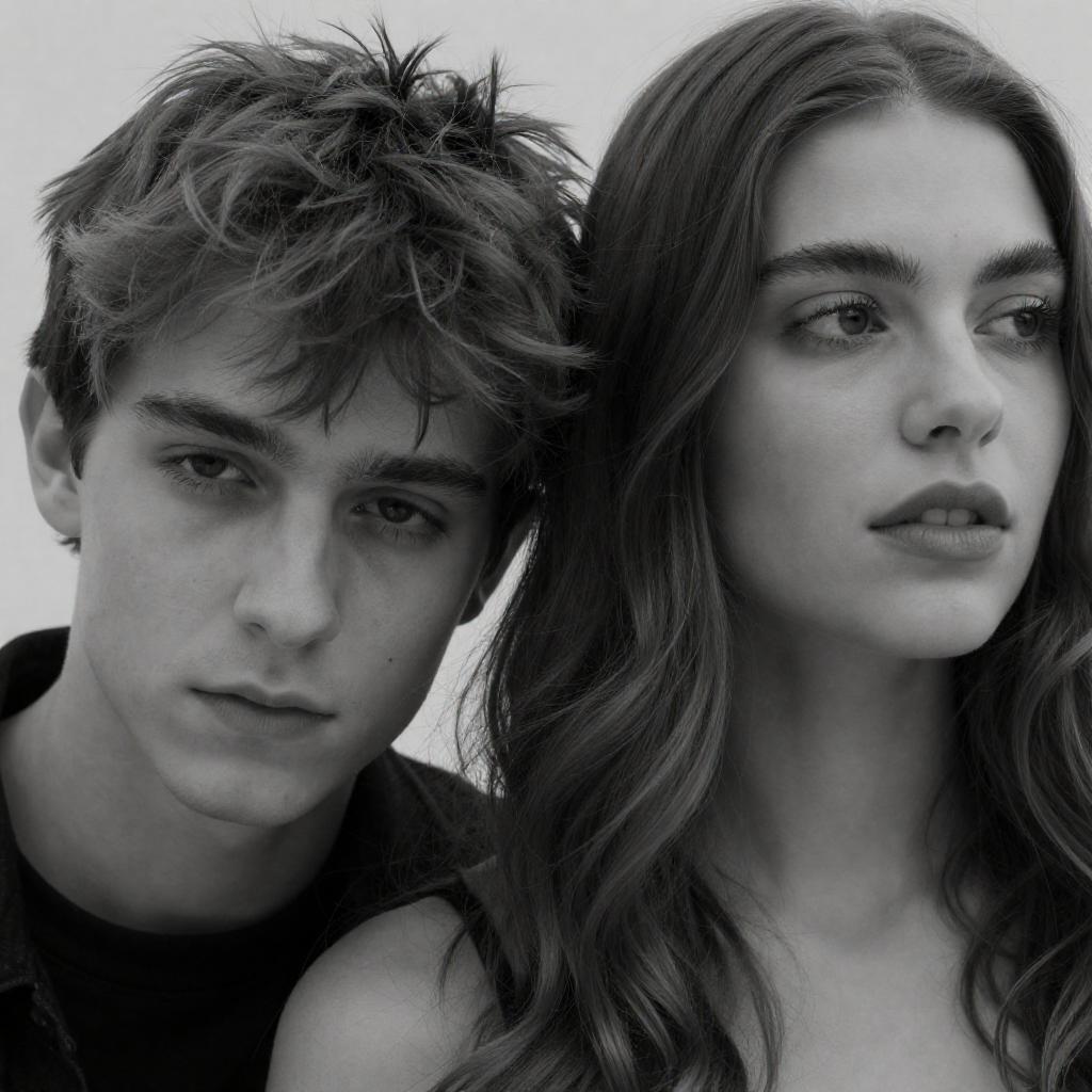 Black-and-white photograph of a young man with slicked-back hair, wearing a white shirt, looking to the left, and a woman with curly hair, wearing a sleeveless top, looking up at him. The background is blurred. The man's expression is neutral, while the woman's gaze is attentive.