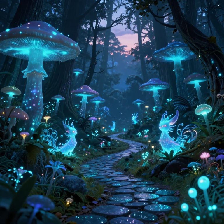 Fantastical forest scene at twilight, illuminated by glowing blue mushrooms and ethereal firefly-like creatures on a mystical, moss-covered path. Digital art