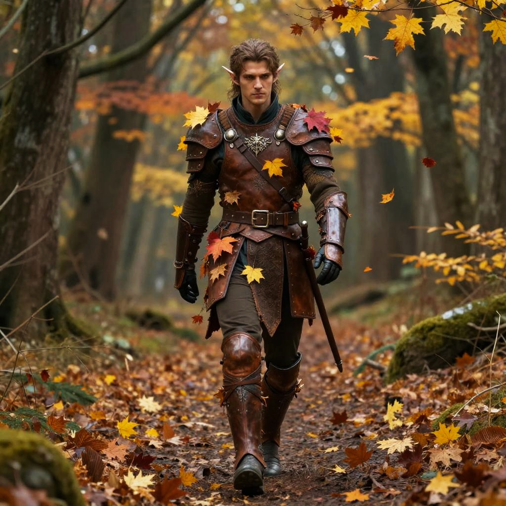 Male autumn eladrin walking through an enchanted forest path, dressed in leather armor adorned with autumn leaves, soft breeze blowing red and yellow leaves around him, tall and elegant with sharp elvish features, fantasy realism