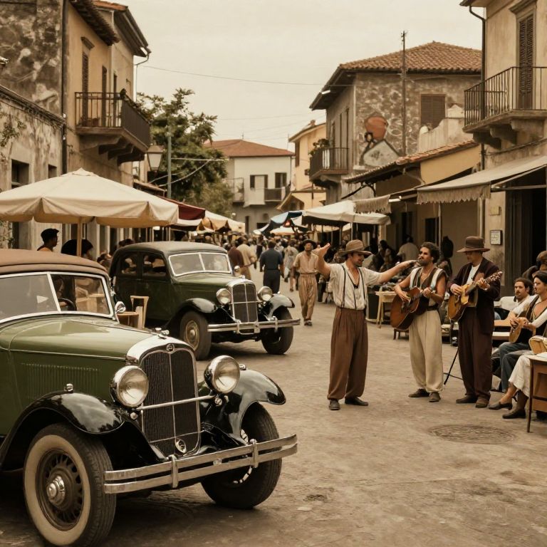 Wop vintage scene of lively 1920s Italian neighborhood, bustling streets with classic cars, market stalls, and passionate street musicians, warm golden hour lighting, detailed textures, nostalgic atmosphere, cinematic composition.