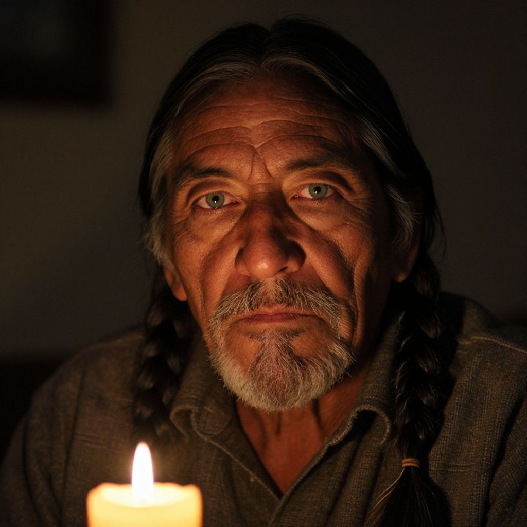 A middle-aged Native American man with a salt-and-pepper beard and piercing green eyes exudes an air of wisdom as he sits in a dimly lit room. The warm glow from a solitary candle illuminates his rugged features, casting dramatic shadows across his face, enhancing the intensity of his gaze. From below, the camera captures an intimate perspective, revealing a mix of contemplation and resignation in his expression. This unique angle not only highlights the texture of his skin and beard but also accentuates the interplay of light and shadow on his weathered countenance.