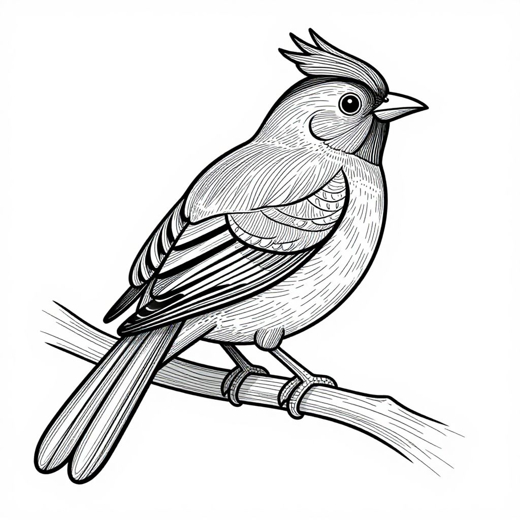 This is a black and white, detailed line drawing of a small bird perched on a branch. The bird, facing right, has a prominent, slightly curved crest on its head, and its beak is small and pointed. Its eyes are round and black, adding a sense of liveliness. The bird's wings are folded against its body, with visible stripes and patterns. The branch it perches on is slightly curved and textured with lines indicating its bark. The drawing uses cross-hatching and fine lines to create depth and texture, and it has a clean, minimalist style. The background is plain white, emphasizing the bird and branch.