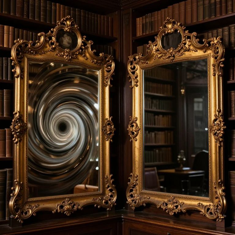 In a dimly lit library, two ornate mirrors stand side by side, their golden frames adorned with intricate carvings, reflecting not mere reflections but alternate realities—one mirror distorting into a swirling vortex of past events, while the other remains eerily still, frozen in a timeless void.