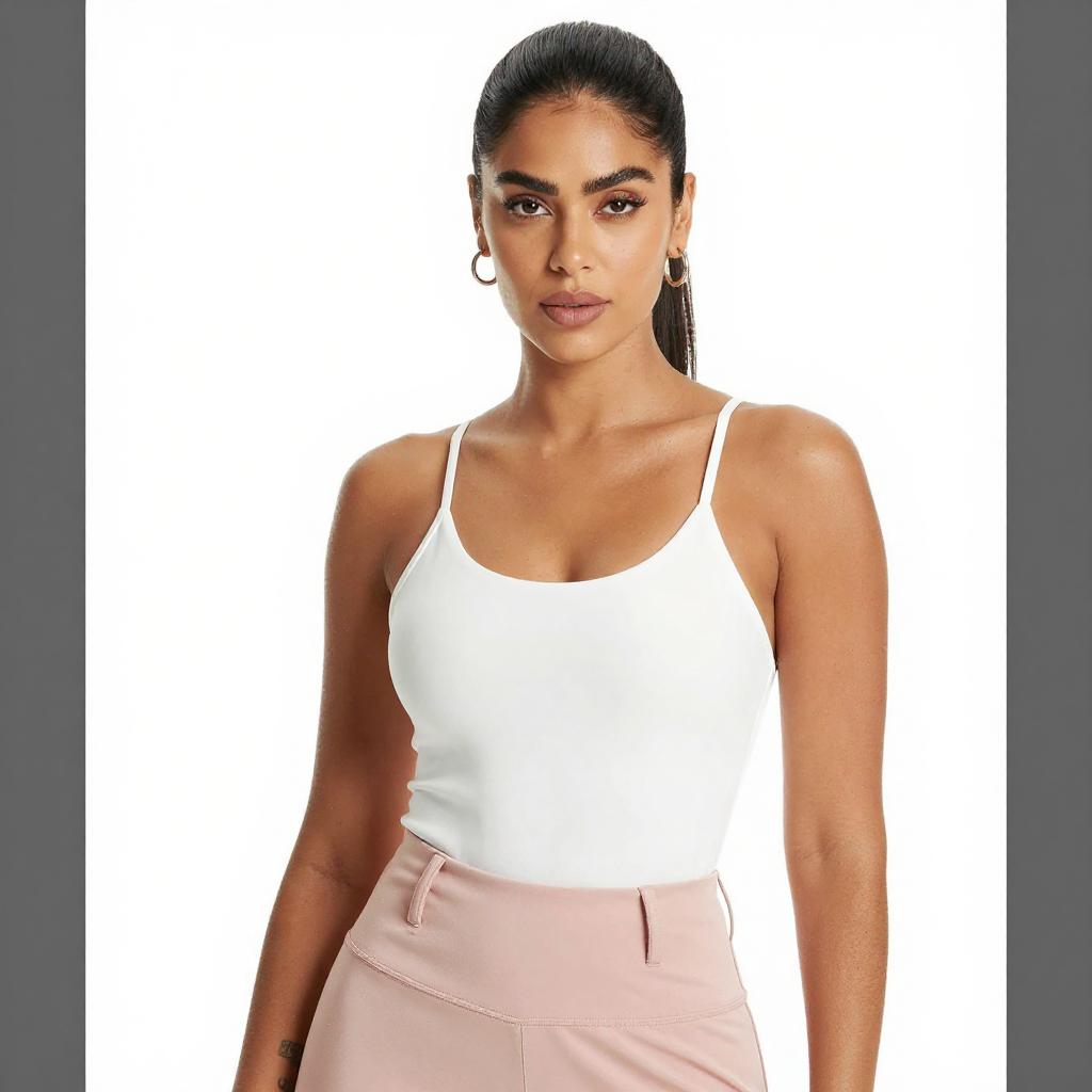 Photograph of a woman with medium brown skin and black hair in a sleek ponytail. She wears a white, fitted spaghetti-strap tank top and light pink high-waisted pants. She has full lips, dark eyebrows, and wears small hoop earrings. Her right hand has a tattoo on the wrist. She stands against a white background with gray borders on either side.