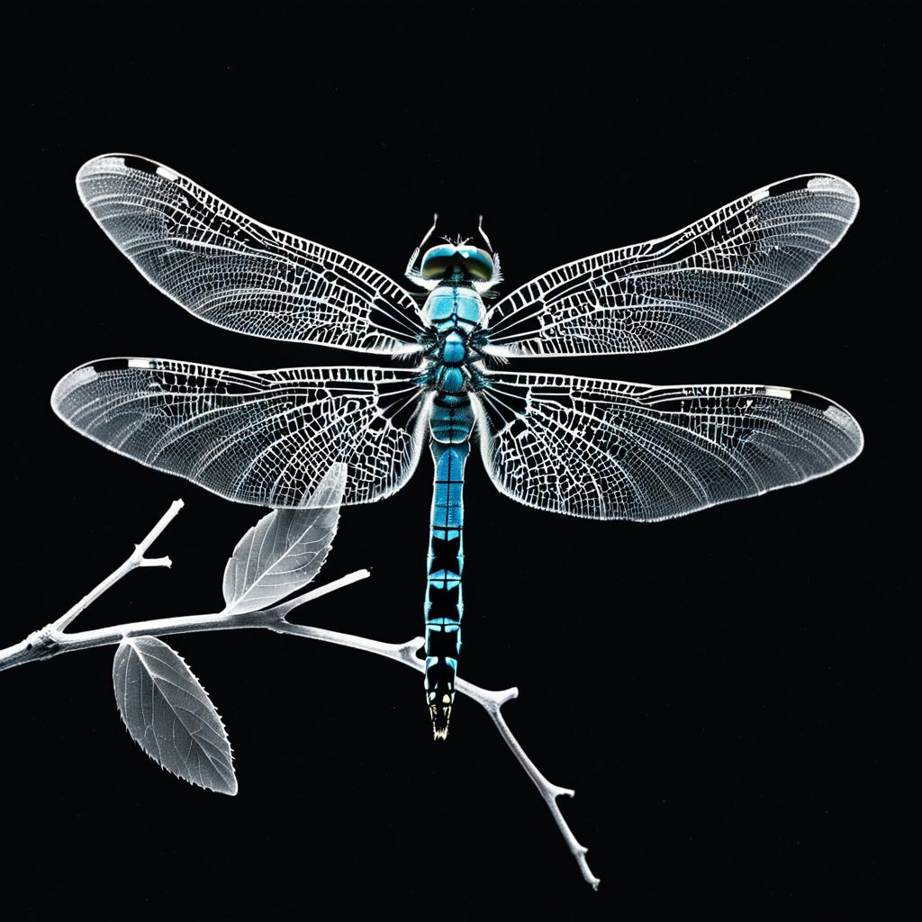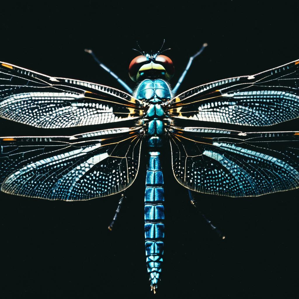 A surreal and captivating scene featuring an enormous, glistening dragonfly sitting indoors beside a curious, young naturalist. The cat’s fur is iridescent and finely detailed, with its vivid sapphire eyes gazing directly at the viewer. The lush, sun-dappled conservatory with exotic plants allows soft, natural light to highlight the textures. The overall mood is curious yet peaceful, blending realism with a subtle touch of fantasy.