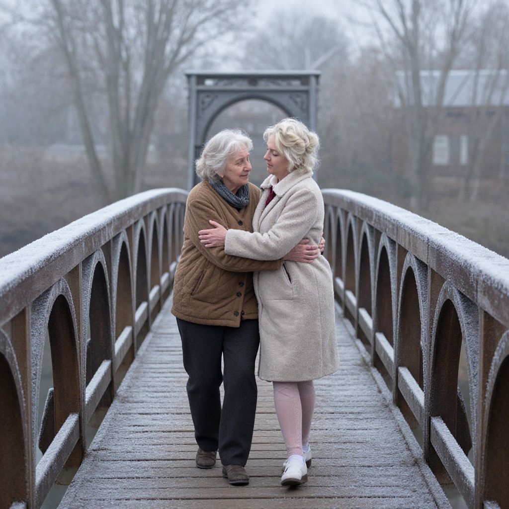 Through the frost-kissed arches of memory, an elderly woman traverses a bridge of time, her footsteps echoing the quiet resolve of reunion with her youthful self, where past and present converge in a tender dance of reflection and renewal.