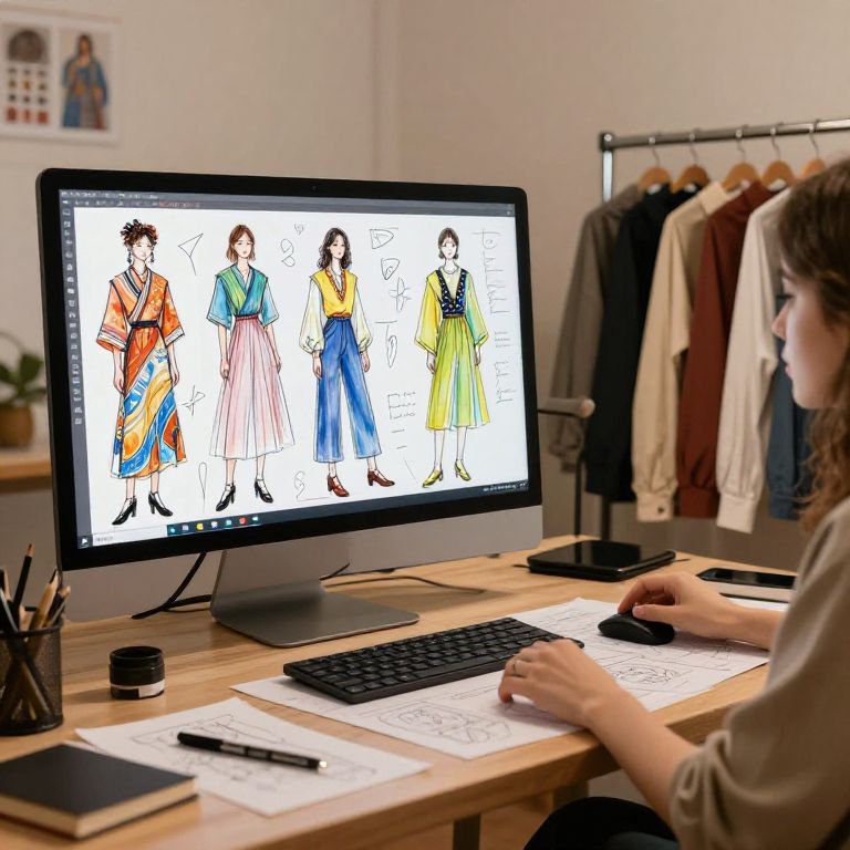 Outfit description generator visualized as an artistic workspace with colorful sketches of fashion outfits on digital screens, designers brainstorming, clothes racks filled with trendy garments, warm lighting, creative studio ambiance, blending traditional and modern clothing inspirations