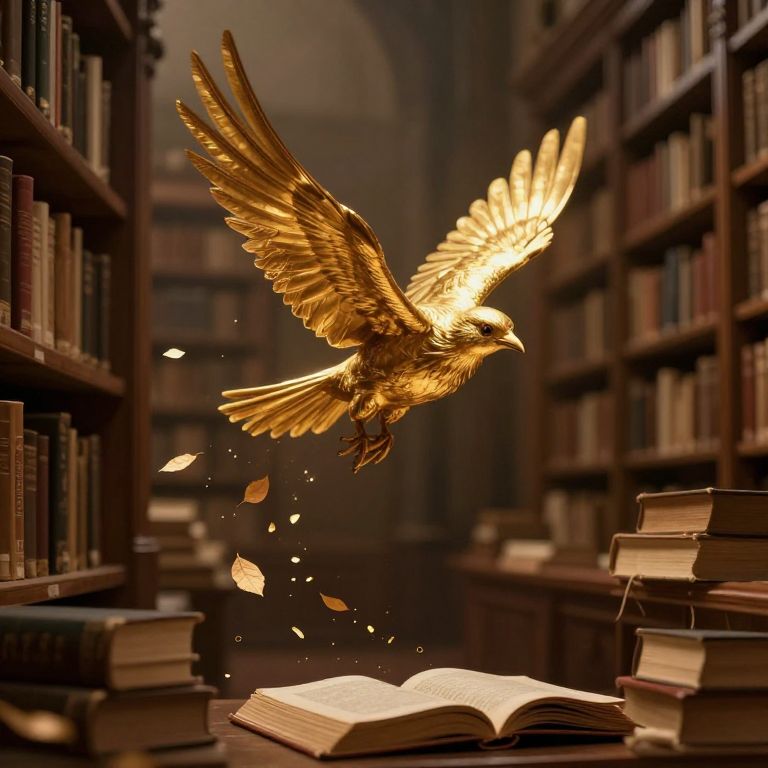 In a hushed library where ancient wisdom whispers, a golden bird takes flight, its wings stirring the air with the scent of aged parchment and the promise of untold stories, as scattered leaves trace the path of knowledge and freedom.