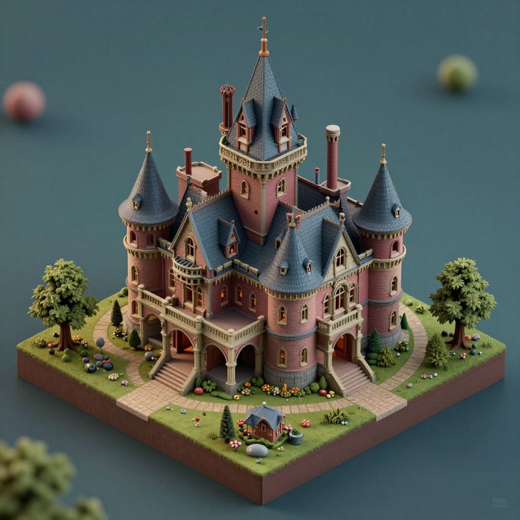 Photorealistic digital model of a pink, turreted medieval castle with blue roofs, surrounded by greenery, trees, and a pathway, floating