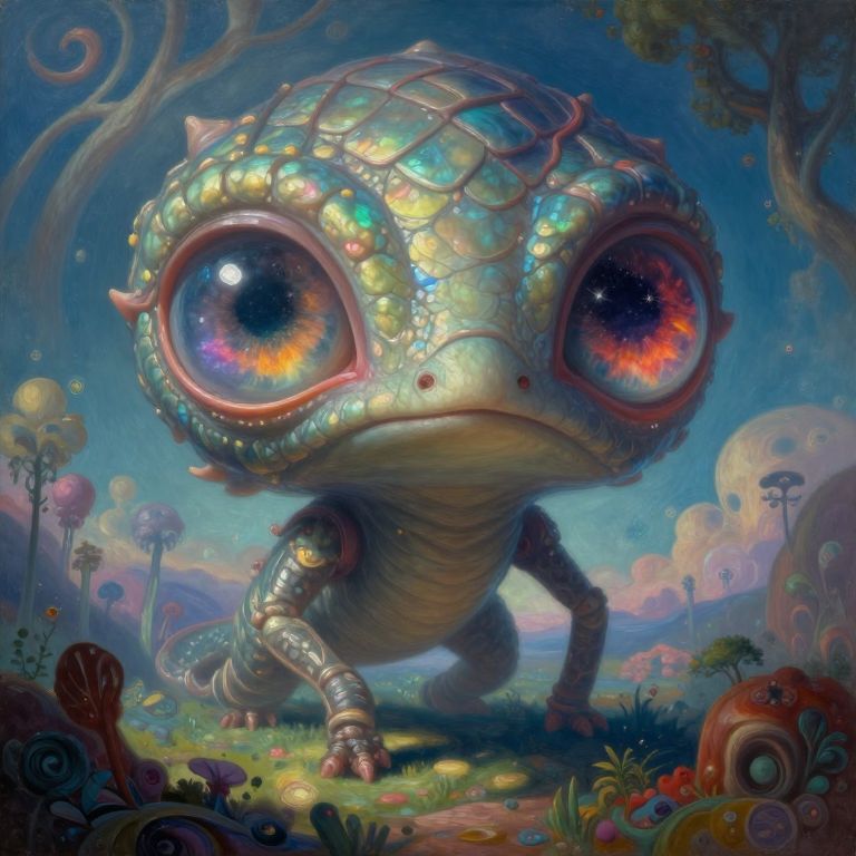 A captivating digital artwork in the mesmerizing style of surrealist paintings captures a surreal scene where an enigmatic, otherworldly creature emerges from the depths of a dreamlike landscape. The creature, a fusion of organic and mechanical elements, sports iridescent scales that shimmer under ethereal light, casting intricate shadows on the surrounding surreal environment. From a unique 'bug's-eye view' perspective, the image focuses on its enormous, luminous eyes reflecting an inner universe filled with cosmic phenomena, evoking both awe and unease as viewers are drawn into this fantastical realm where reality intertwines with the subconscious, inviting them to ponder the mysteries that lie within the depths of our minds.