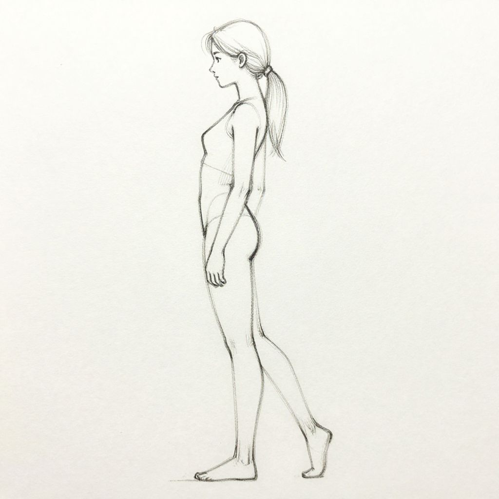 Character base female model, side view with natural stance, digital sketch style, delicate line work highlighting silhouette, no clothing or accessories, clean and simple background for focus on form and posture.