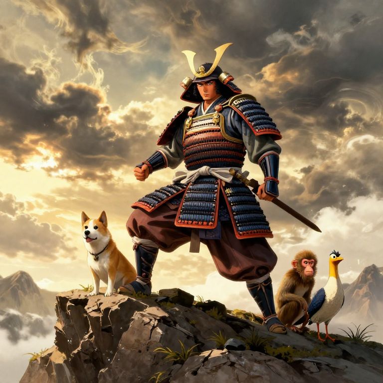 Momotaro in heroic pose atop a mountain cliff, wearing ancient samurai armor, with his loyal animal companions—the dog, monkey, and pheasant—at his side, against a dramatic sky filled with swirling clouds and warm golden light