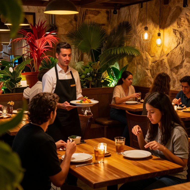 Restaurante scene inside a cozy, rustic interior with warm lighting, wooden tables, bustling waiters carrying plates of gourmet dishes, vibrant plants around, customers enjoying meals, a lively and inviting atmosphere, detailed textures and soft shadows.